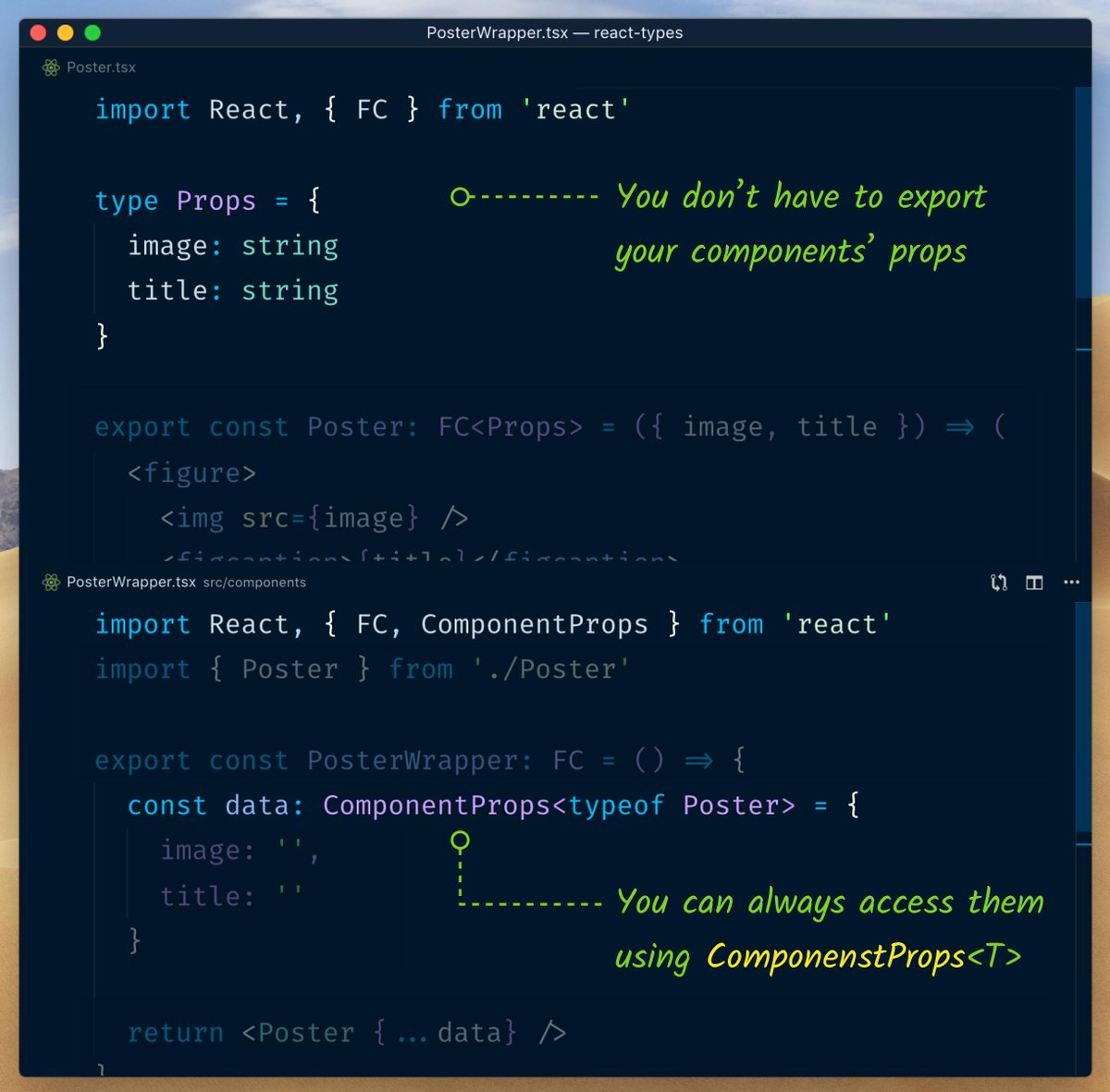 You don't have to export component's prop type/interface - when you need it you can extract it from a component using the handy ComponentProps